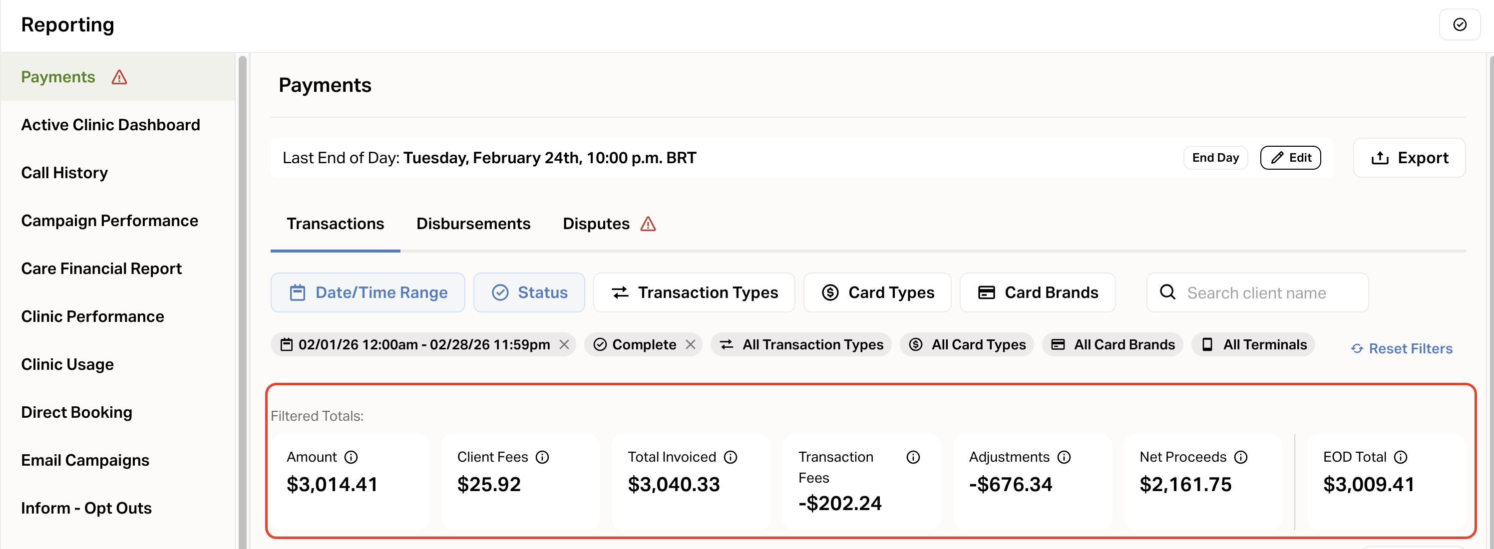 The Payments report in Flow provides a view of all transactions processed through your clinic. This report helps you track invoices, fees, disbursements, and overall revenue. Below is a breakdown of each section and how to use it effectively.