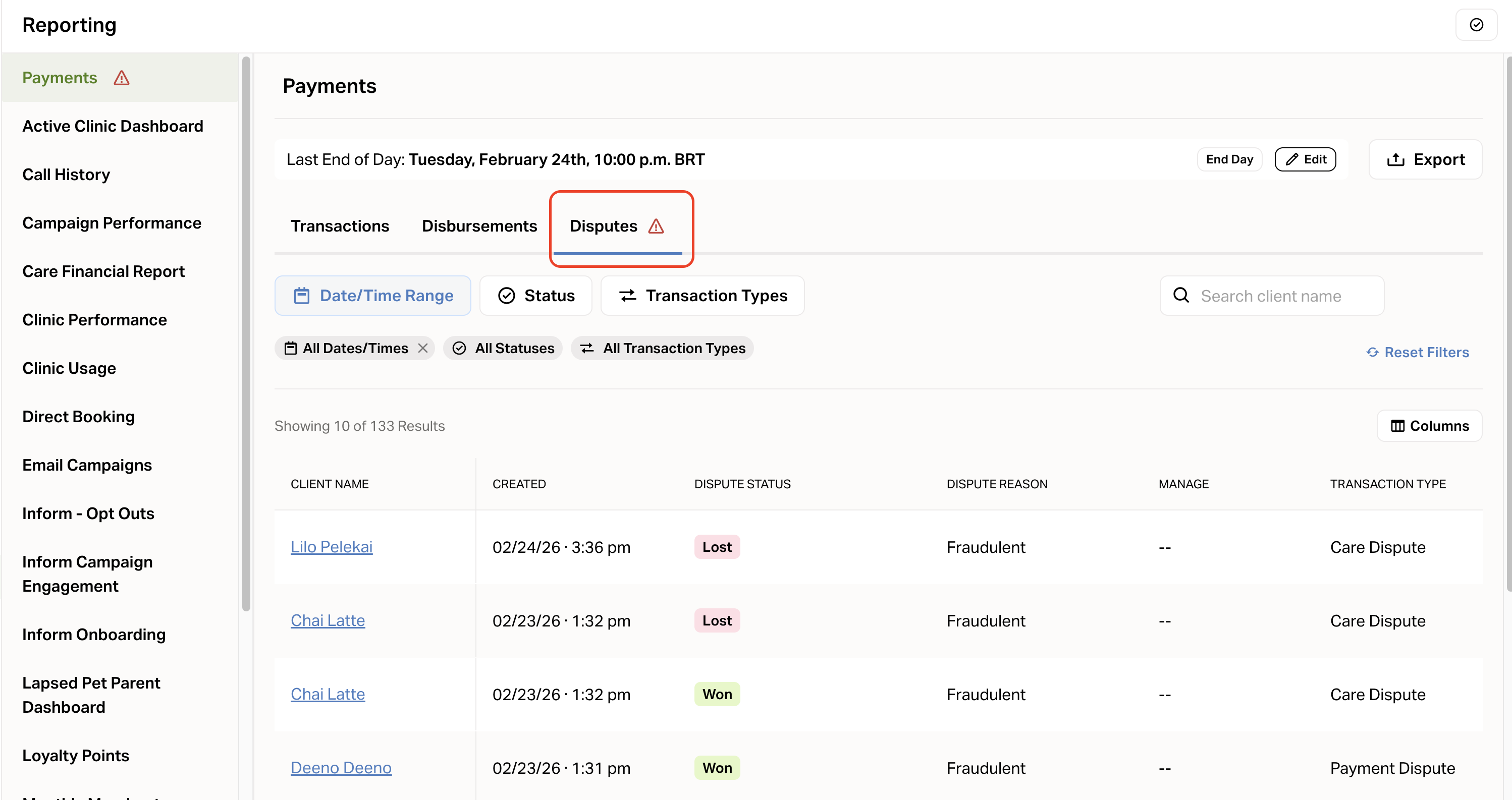 If a client disputes a charge (e.g. via their card provider), it will appear here. You’ll be notified of the reason, amount, and deadline to respond. Make sure to submit evidence (like signed consent forms or invoices) before the due date to avoid chargebacks.