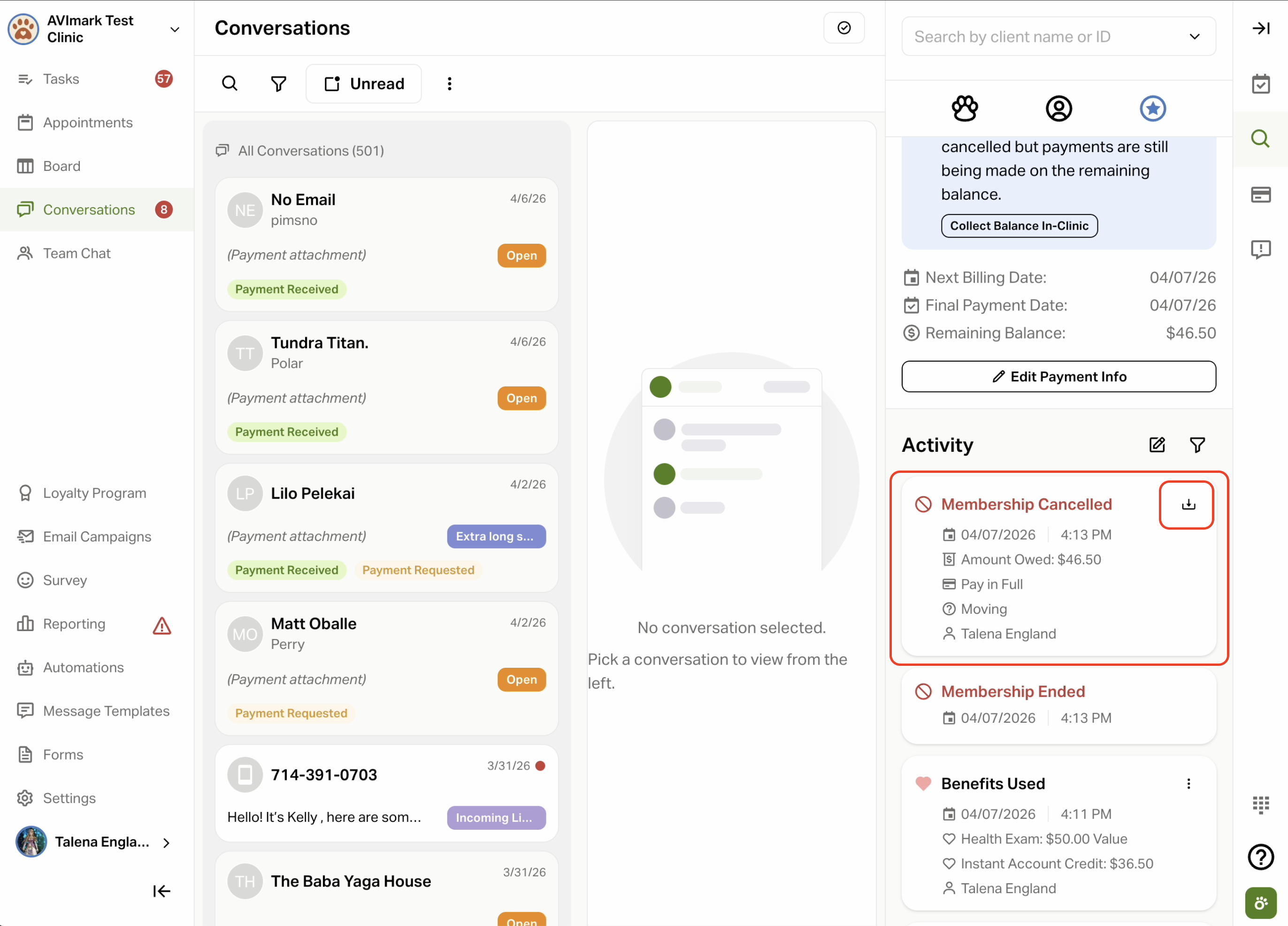 - Click Collect Balance In-Clinic within the blue warning