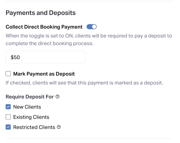 In Require Deposit For you can select between: New Clients only, Existing Clients and/or Restricted Clients (clients with an Active alert and restriction to Direct Booking).