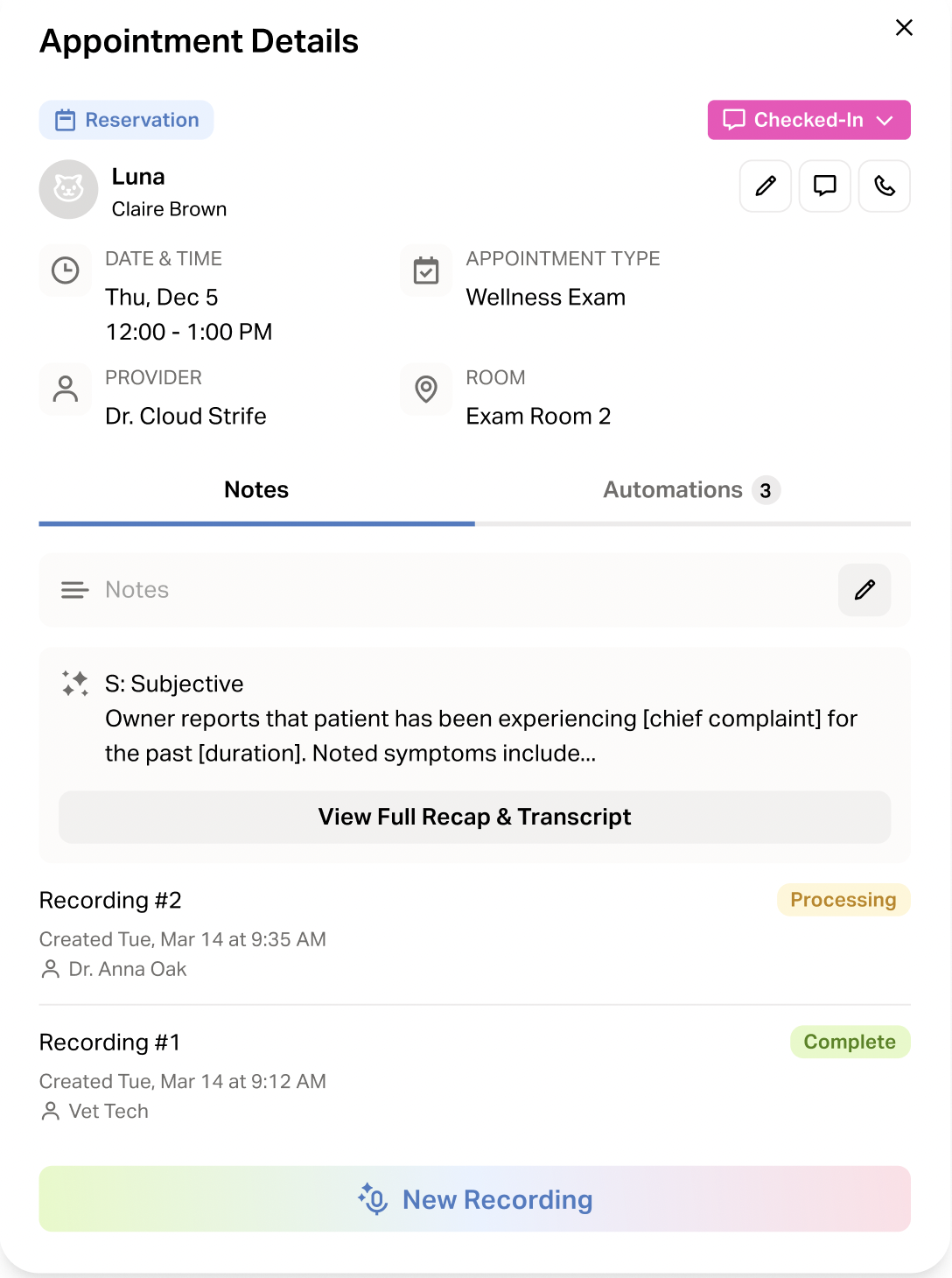 At this time it's not recommended to record a single AI Scribe for a multi-pet appointment. While AI Scribe may be able to to distinguish each pet by the Technician or Doctor saying the pet's name out loud, it may not be 100% accurate, depending on the template used. We recommend creating separate appointments for each pet, so AI Scribe can generate a separate summary.