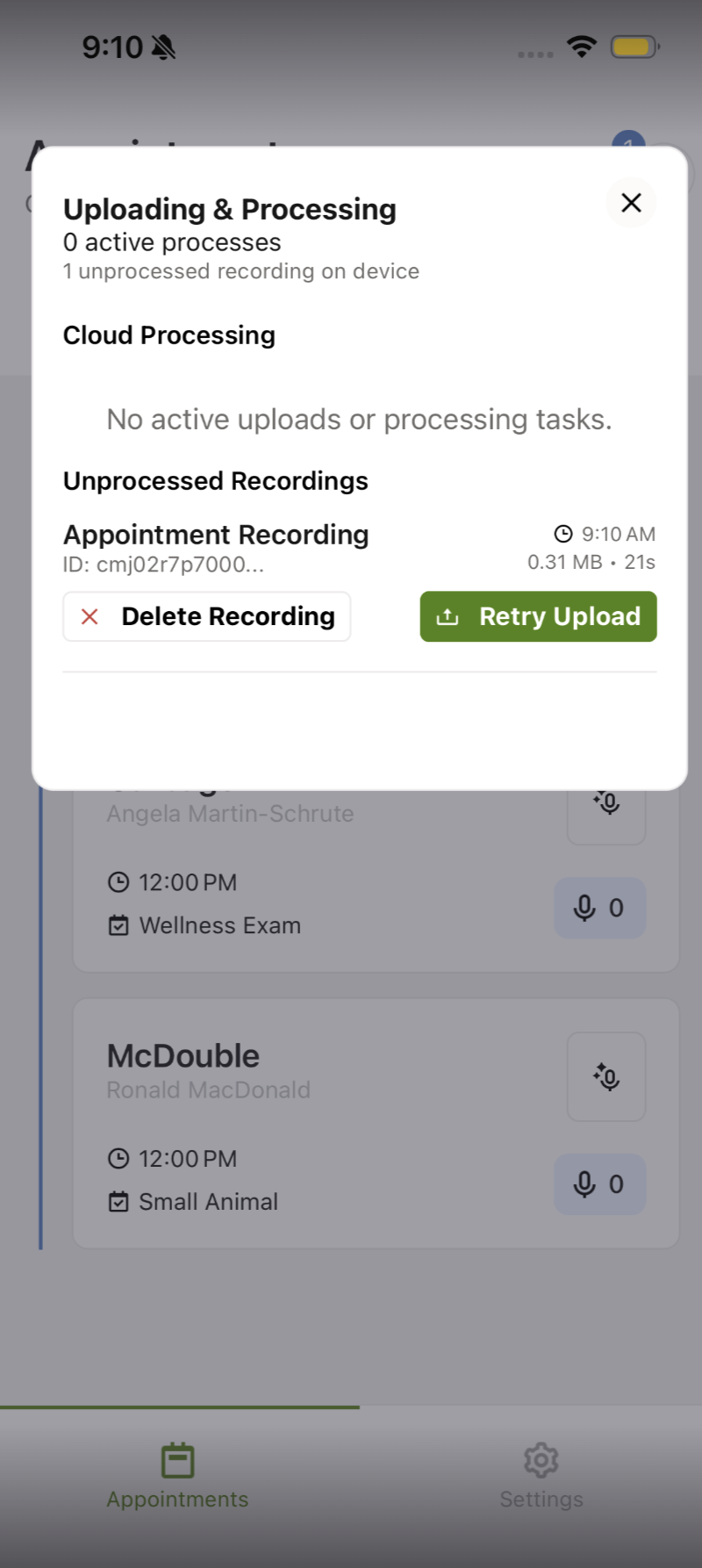 If you've recorded through the AI Scribe mobile app, please navigate to the checkmark at the top right of your device and check if there are any in an unprocessed state. Select the "Retry Upload" option to trigger them to process again. If you continue to experience issues with this, please reach out to our support team for some help! Example: