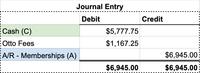 When Otto collects monthly payments from your members, this report helps you record those payments. This entry shows the payments made by your active members. It accounts for Otto's processing fees and reduces the amount your members owe you.