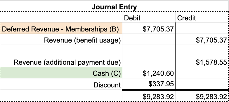 Accounts Receivable) because it represents the future payments you are supposed to receive from these new members. Labeled as Unbilled A/R in the Care Financial Report. - Credit, Deferred Revenue - Memberships (B): This is the liability portion of the new plans. It acknowledges that you "owe" this value in future services to these members (ie. unused benefit credits). Labeled as Deferred Revenue in the Care Financial Report.