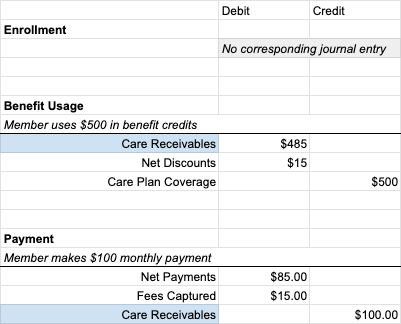 - Debit your Care Receivables account by the amount shown in Benefit Usage section labeled “Deferred Revenue”