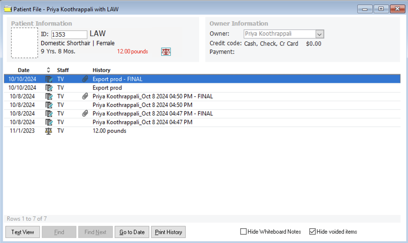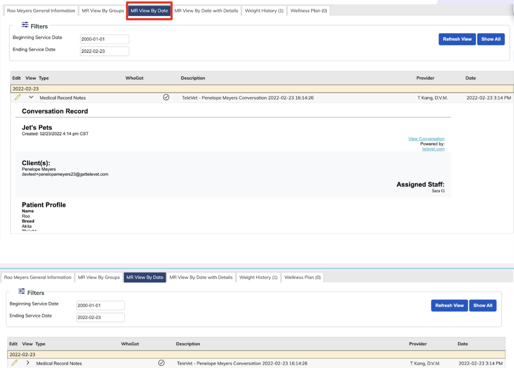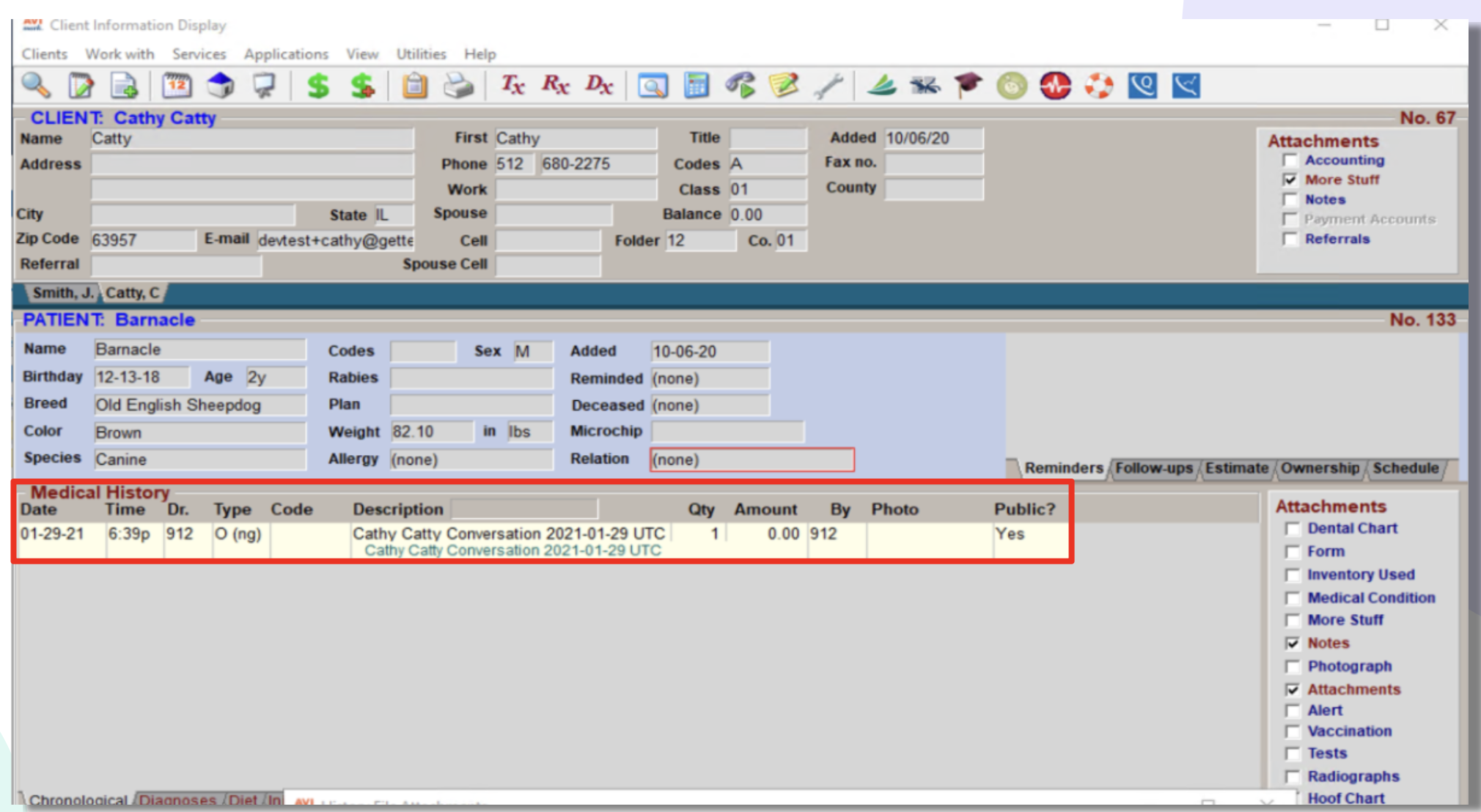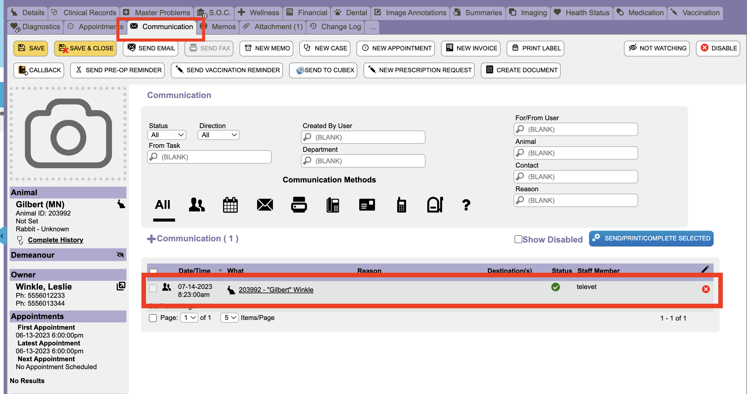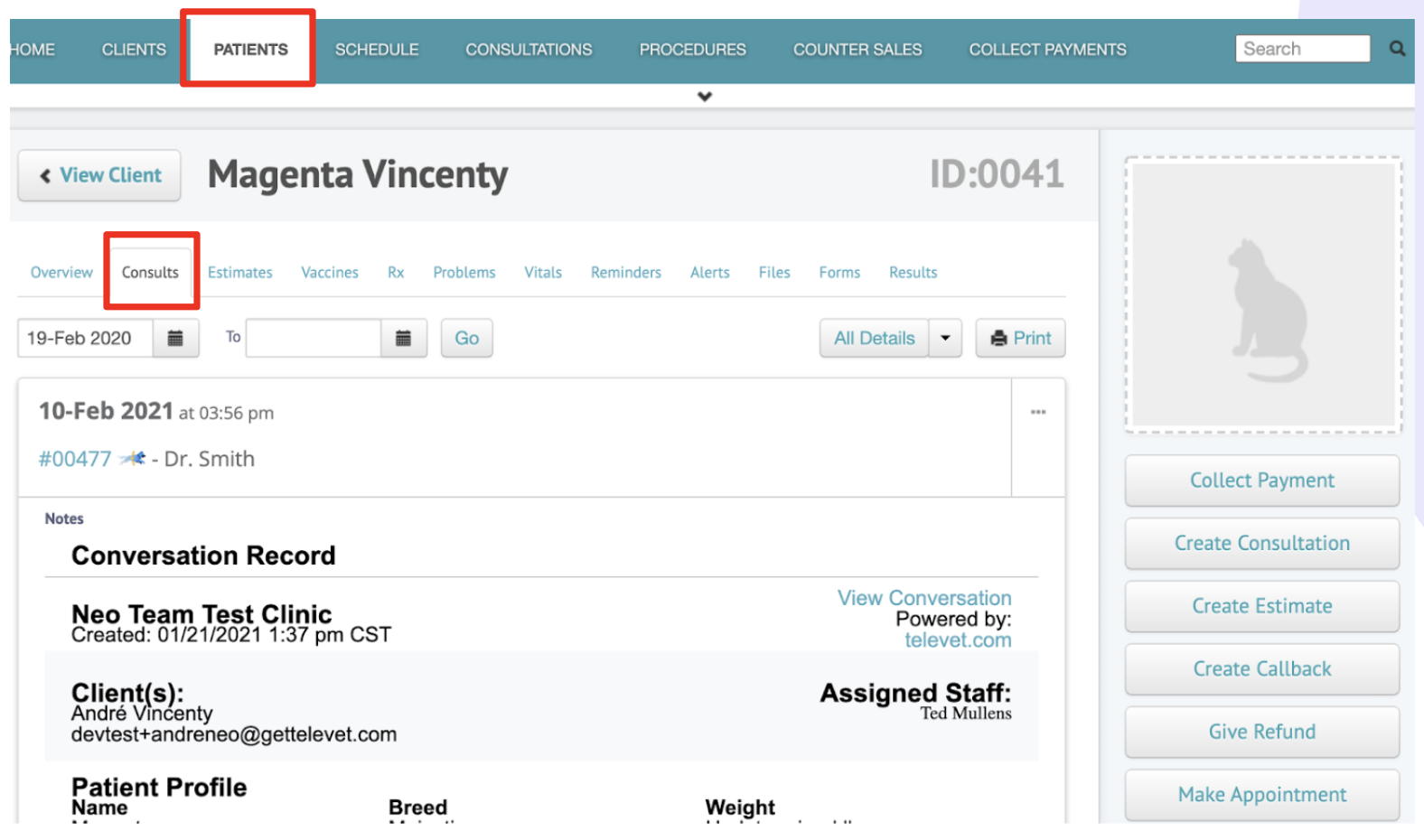 In ezyVet, search desired pet name at the top left, under the purple tab labeled “Animals” and click on Communication tab. A list of conversations will be found in the communication log, click on the desired communication to see the export. Exported AI Scribe can also be viewed from the blue client record within the Communication tab.