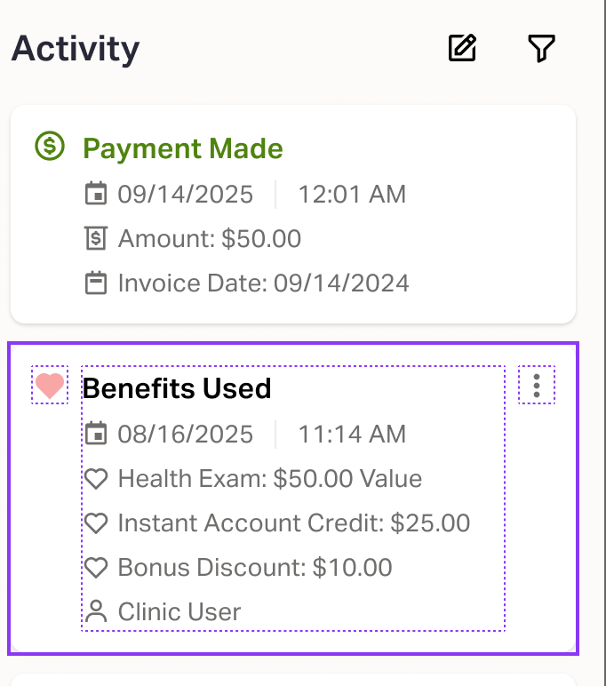 A new Benefit Used card will appear in the Activity Log once completed.
