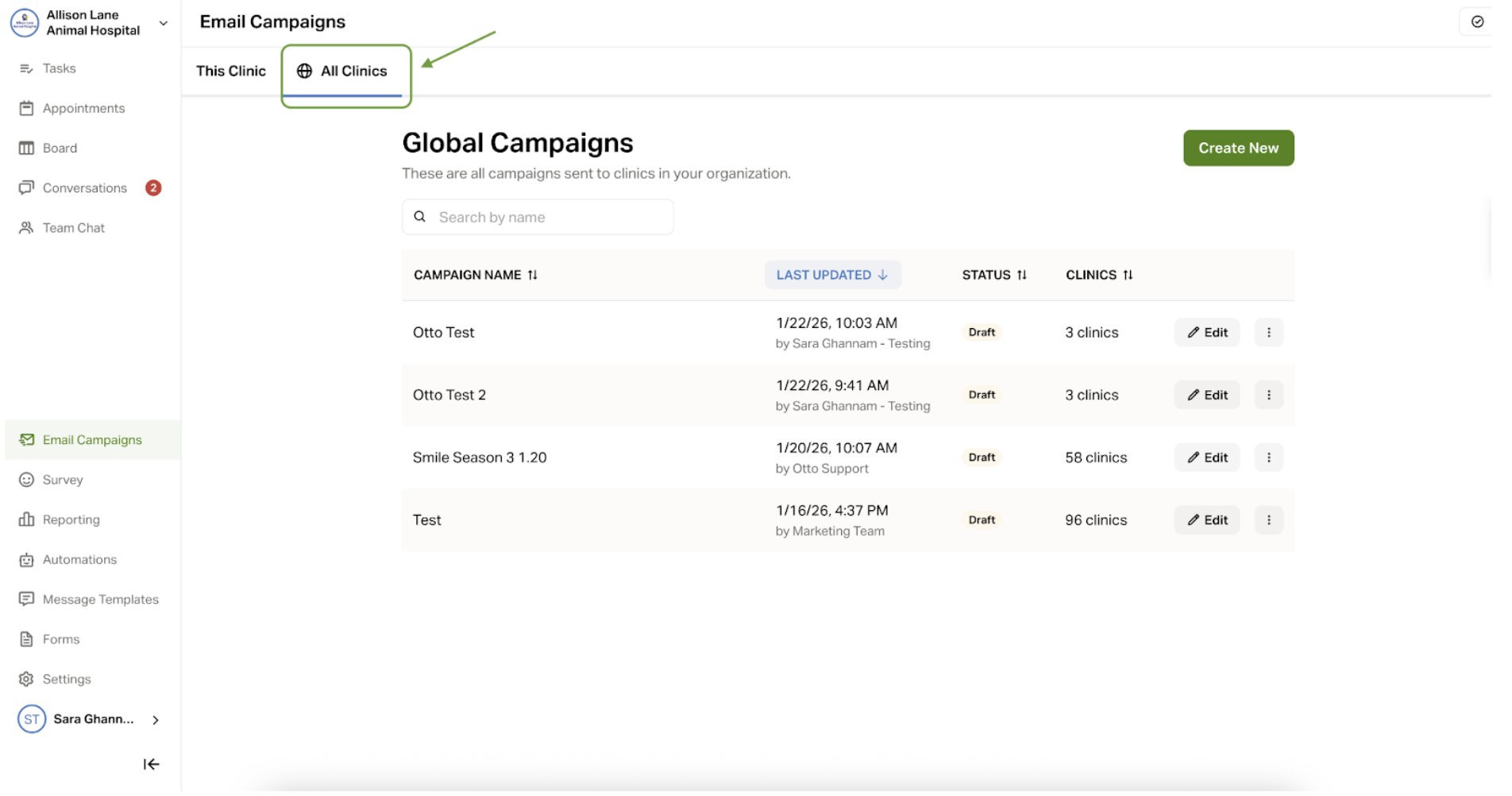 Step 1: Navigate to Email Campaigns in Flow and select the All Clinics tab. Select Create New to begin creating your global campaign.