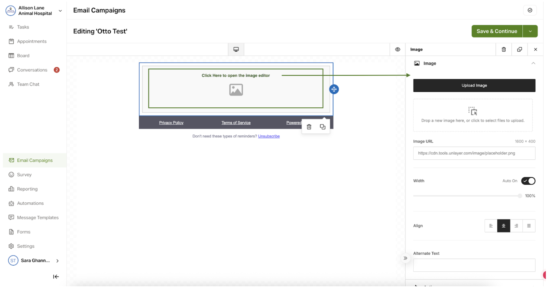 To add the {{externalPhoneNumber}} merge tag to an image, click on the image in the email builder, navigate to the Action section, ensure "Call Phone Number" is selected in the dropdown, and type {{externalPhoneNumber}} in the URL section. This will make your image clickable and allow clients to call each clinic’s unique phone number.