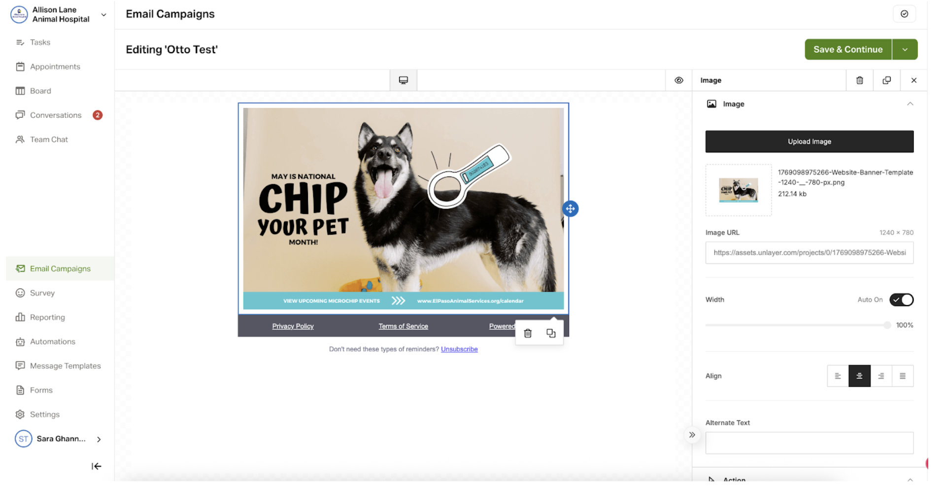 When you're happy with how your email campaign looks and what options it will give the clinic's clients, Save and continue to the final page to set a subject line, choose recipient criteria and a reply to.