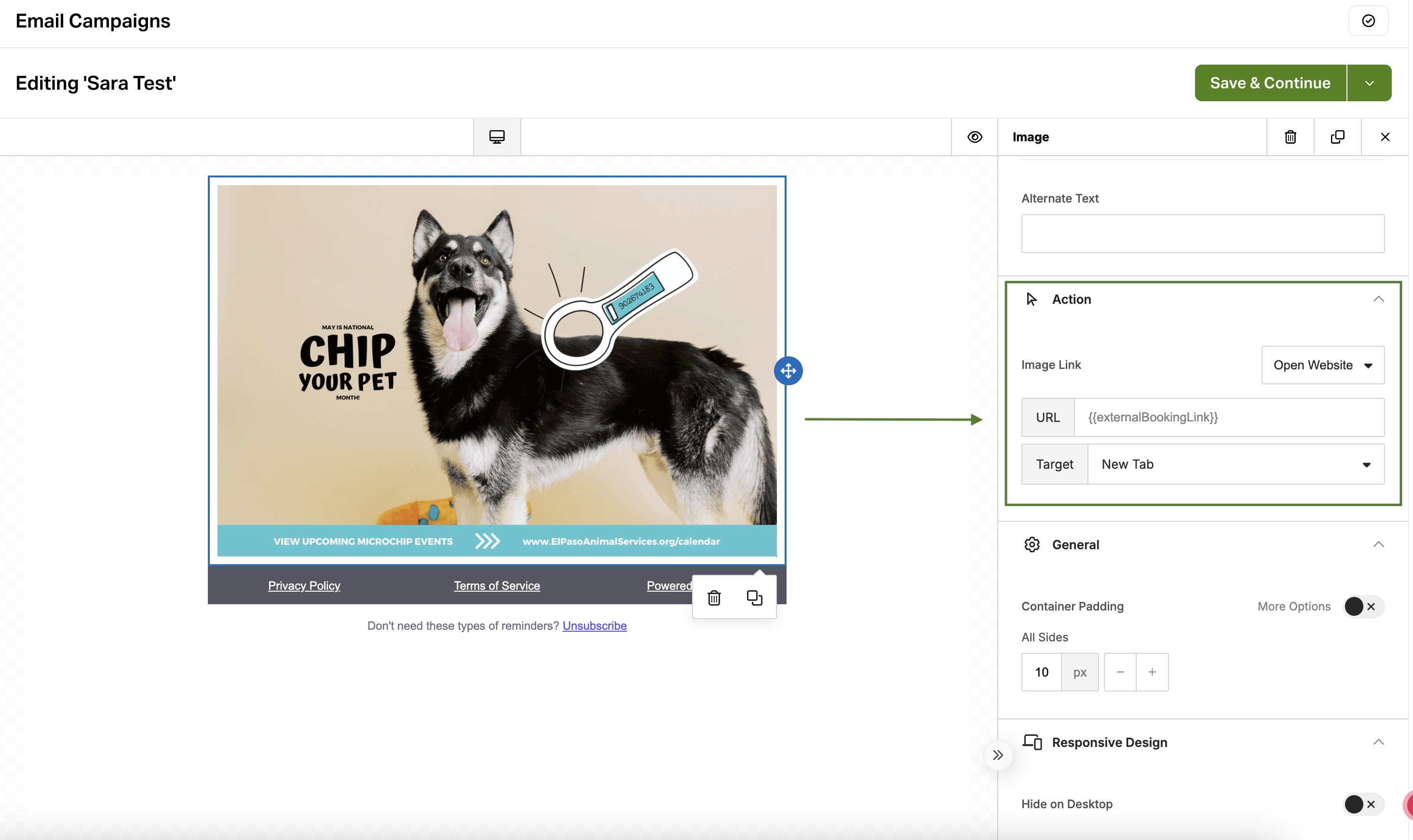 To add the {{externalBookingLink}} merge tag to an image, click on the image in the email builder, navigate to the Action section, ensure "Open Website" is selected in the dropdown, and type {{externalBookingLink}} in the URL section. This will make your image clickable and take clients to each clinic’s unique booking URL.