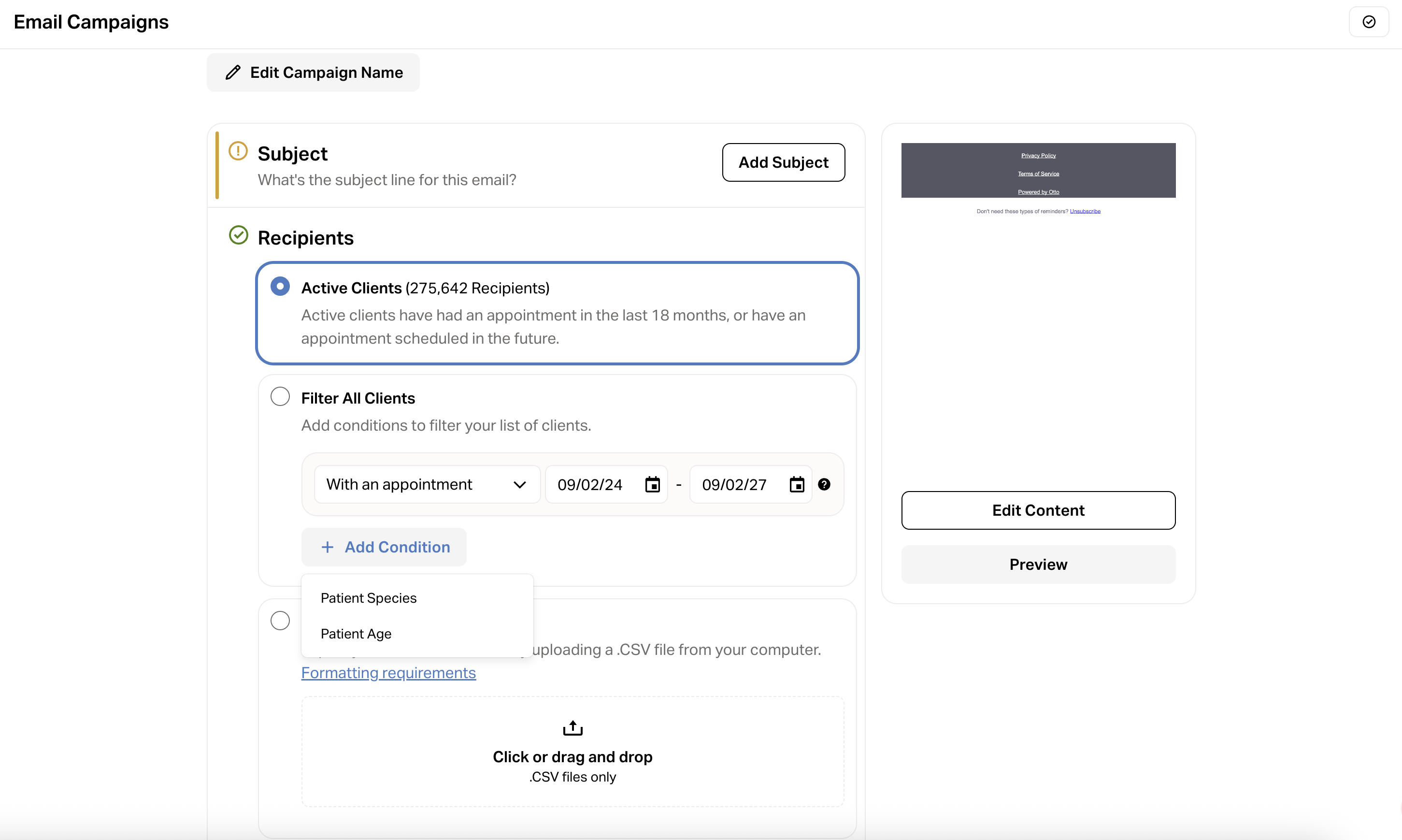 Global email campaigns will automatically identify all of the selected clinic's clients that have had an appointment in the last 18 months or have an appointment scheduled in the future. That is our criteria for "Active Clients". You have the option to Filter All Clients by appointment date, pet species and pet age.