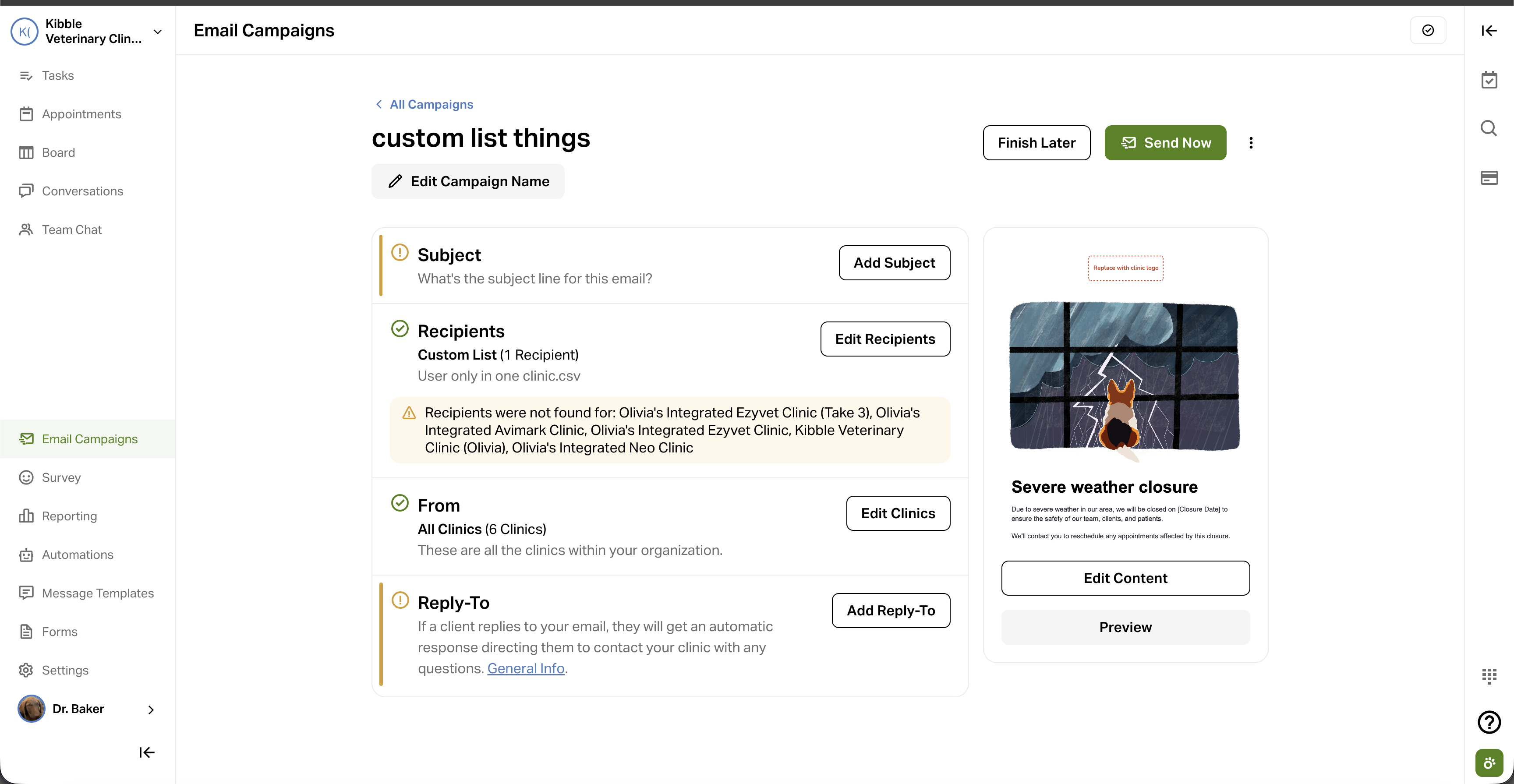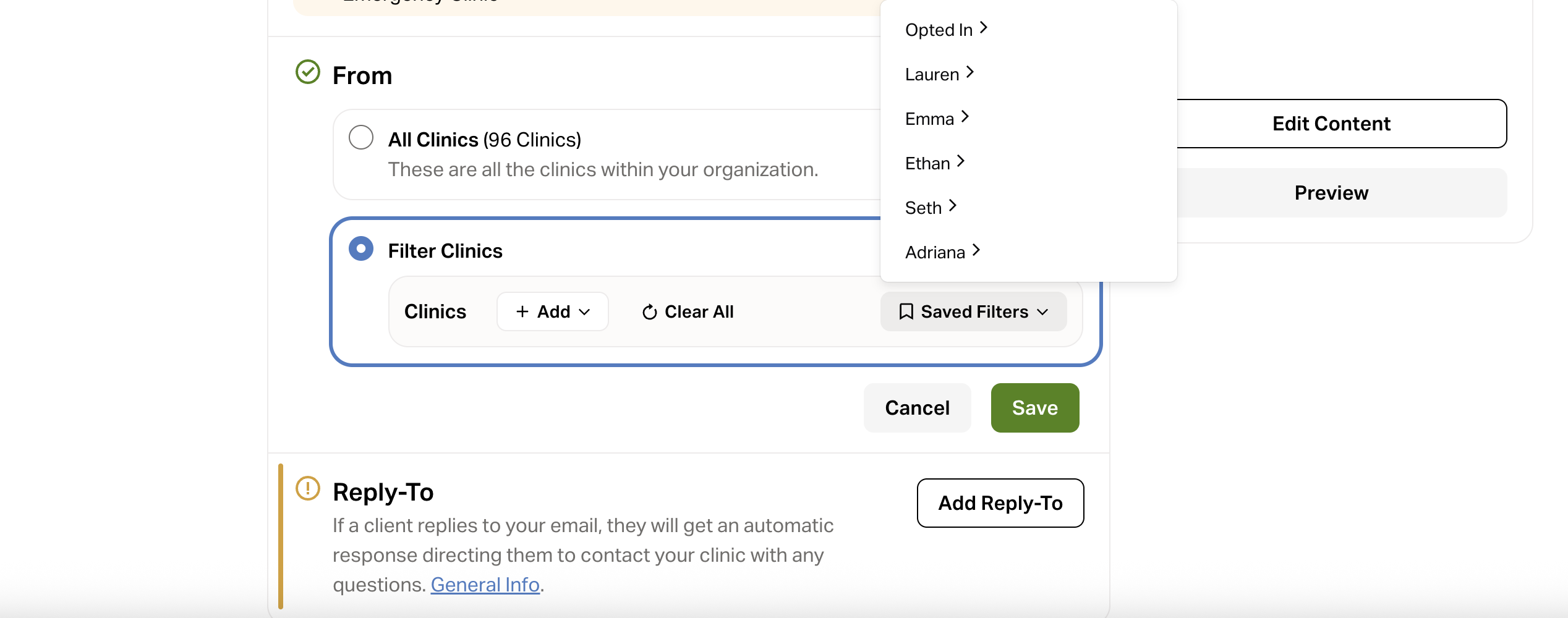You have the option to specify which clinics you would like to email on behalf of in your campaign. The builder can offer the ability to send from all clinics in your organization or Filter Clinics by preference.