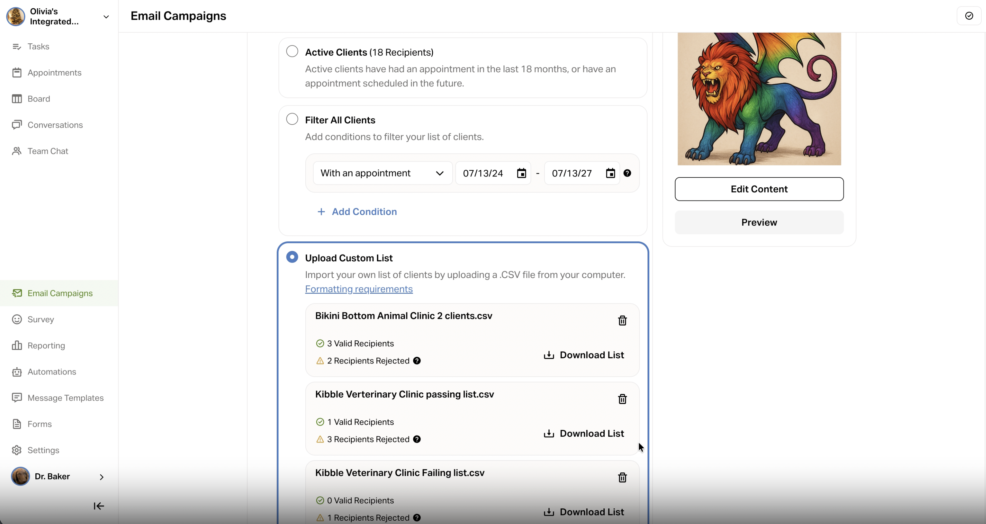 Upon initial upload each file will be checked across the selected clinics to determine which client in each list is a valid recipient for the campaign. The number of valid and invalid recipients will show beneath the list name.