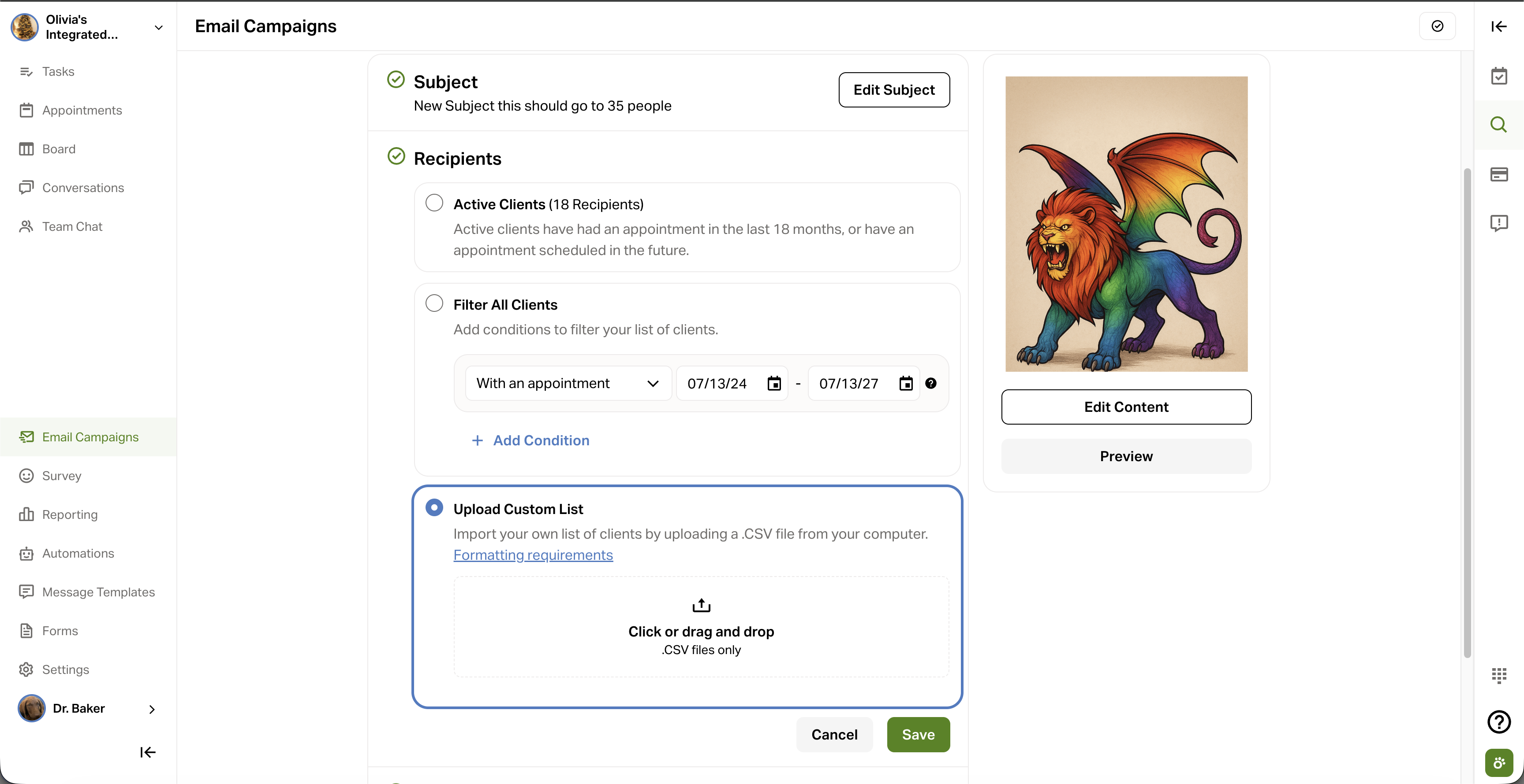 Note: To avoid having to set these up each time, use Saved Filters to quickly save a set of clinics you regularly send email campaigns on behalf of.