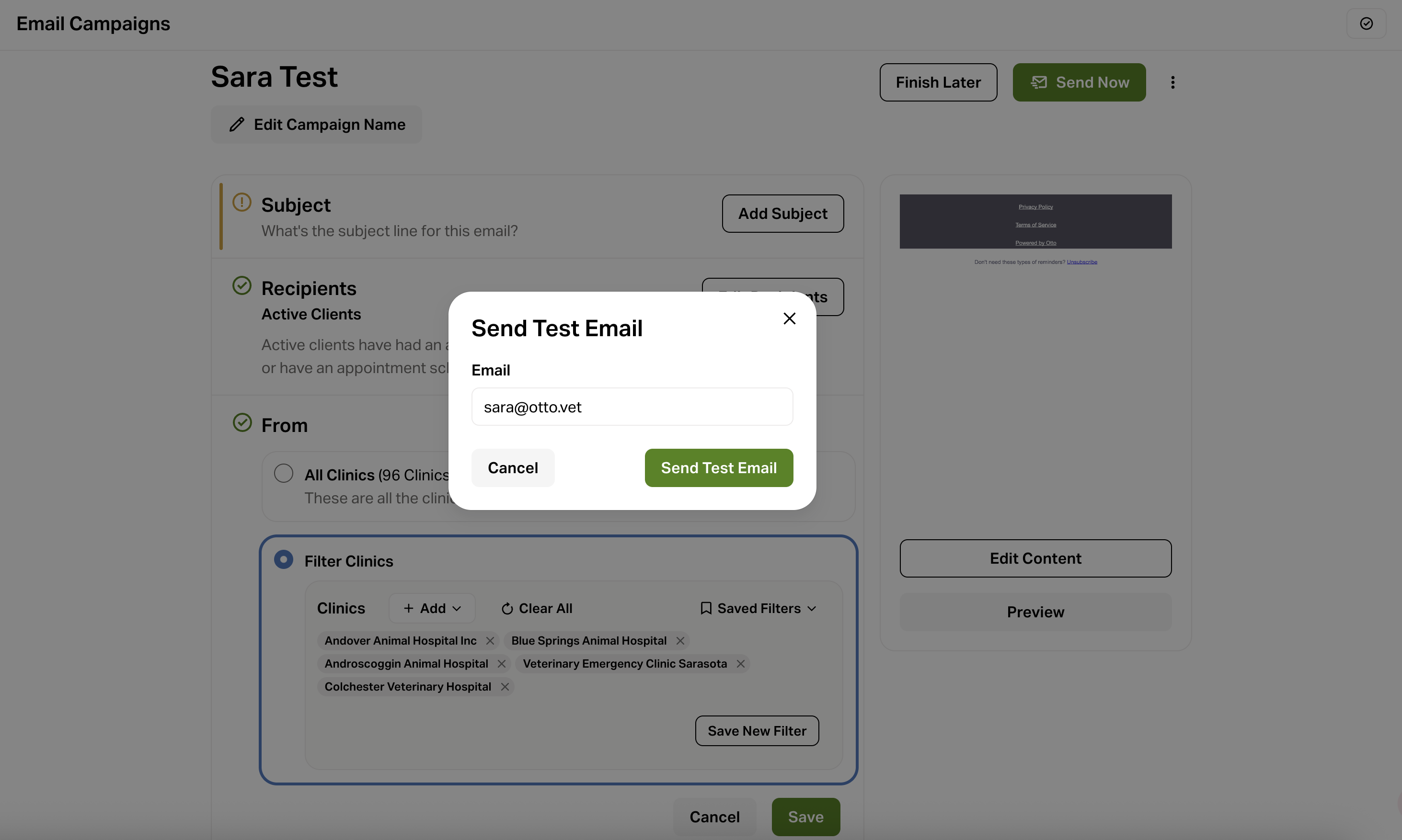Selecting the 'Send Test Email' option will awknowledge how many clinics are selected and allows you to send a test email to yourself, or another team member, on behalf of each clinic selected in your criteria: