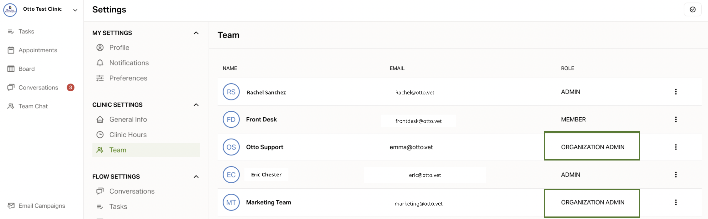 In order to get started, specific clinic admins must be updated as 'Organization Admins' by the Otto Support team. To see who is an Organization Admin in your clinic, navigate to your Flow Settings > Team page: